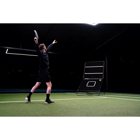 La rete superiore del rimbalzatore può essere regolata in un batter d'occhio su due diverse tensioni. La tensione elevata della rete assicura che la palla rimbalzi immediatamente verso di te. Preferiresti che la palla rimbalzasse prima a terra? Quindi modifica la tensione netta per mettere alla prova i tuoi profitti. Grazie alle diverse tensioni della rete, il rimbalzatore da padel EXIT Smash è adatto a ogni colpo e offre un'esperienza di allenamento versatile per giocatori di padel di tutti i livelli.