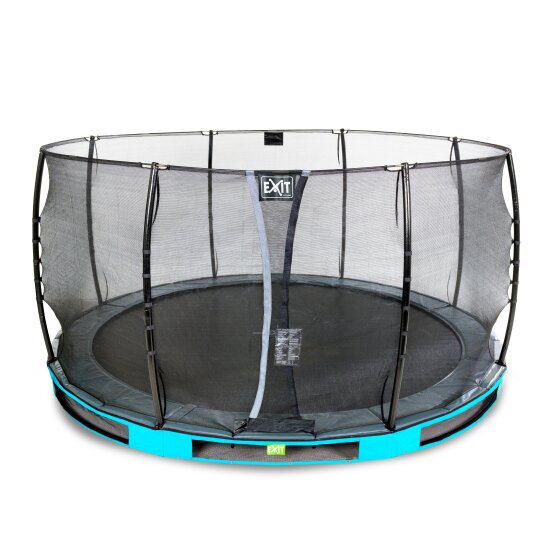 The EXIT Elegant ground trampoline with Economy safety net is a round ground high quality trampoline with grey padding and a blue skirt. Part of this trampoline is dug into the ground not for extra safety, but it also looks great in your garden. The Elegant ground trampolines with Economy safety net are safe, look good and are easy to assemble!
